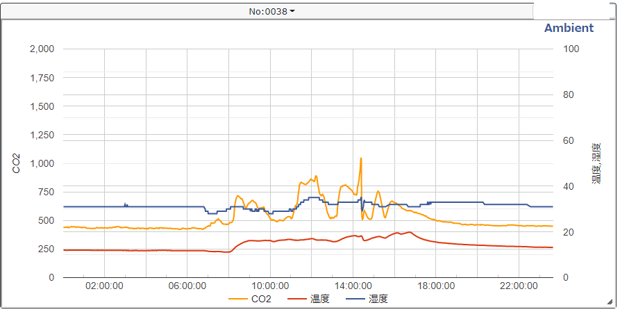 「Co2」、「温度」、「湿度」は折れ線グラフにて表示、