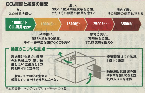 日本産業衛生学会からは1000ppm以下を良い状態としたCO2濃度と換気の目安の指標も