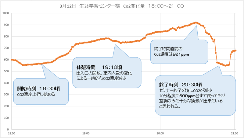 今回は休憩時間前の19:00頃の時点で700ppm(弊社機器では注意表示)を越えたことに