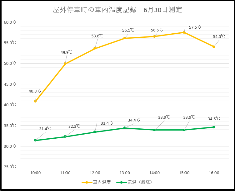 下図は6月30日の10:00〜16:00まで社用車を屋外に停めて測定した車内温度のグラフです。