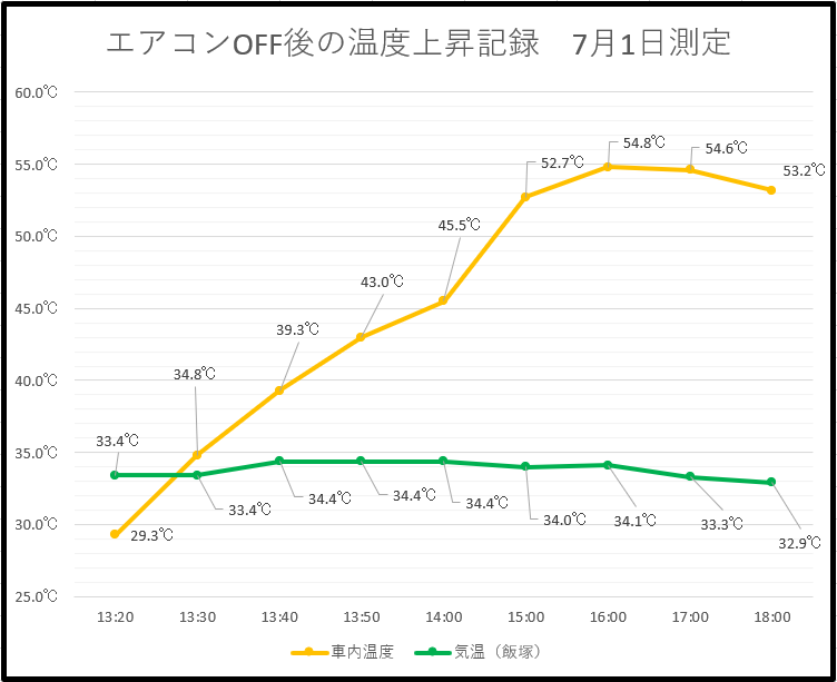 エアコンOFF後に屋外に停車して温度上昇を確認しました。グラフを見て頂くと