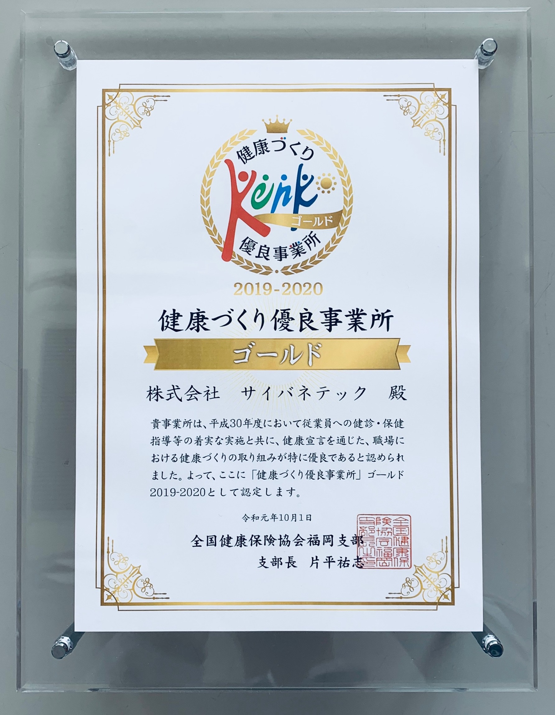健康づくり優良事業所ゴールド2019-2020の認定を受けました。